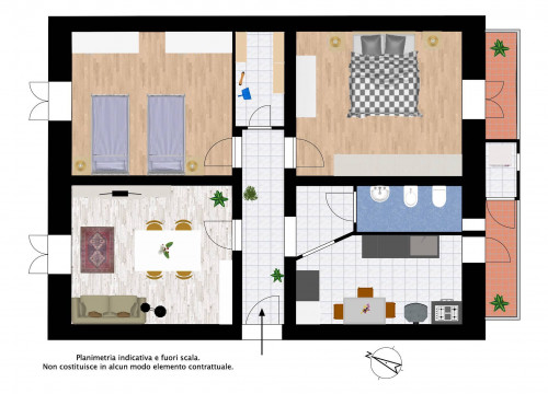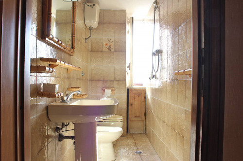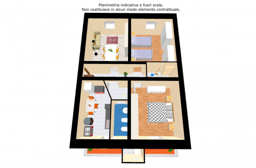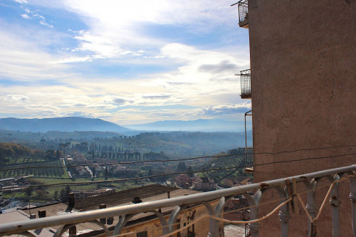 Entrando ci troviamo nell'ingresso che, posto centralmente, distribuisce l'accesso ai vari ambienti: subito a destra c'è un disimpegno e quindi il bagno e la cucina abitabile, con una cappa funzionante, uno spazio ripostiglio in alto con la riserva idrica e l'affaccio sul primo dei balconi, entrambi con vista verso sud-est, dove si trova il ripostiglio esterno. Di fronte al disimpegno c'è la stanza destinata a soggiorno che affaccia sulla via principale. Più avanti, sullo stesso lato, una delle due camere matrimoniali; la seconda è sul lato opposto e ha il suo balcone che guarda il Gennaro e il parco dei Monti Lucretili. A completamento, in fondo al corridoio, un secondo ripostiglio, più ampio. I soffitti sono alti poco sopra i 3 metri.