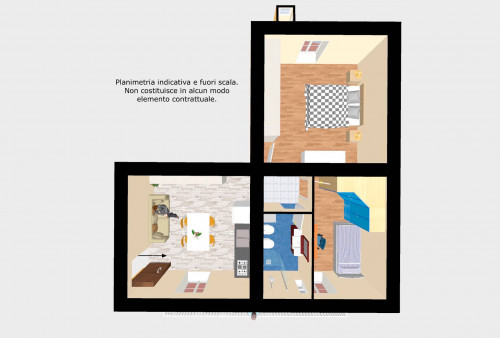 L'interno dell'abitazione è composto dal soggiorno con l'angolo cottura con accesso al balcone principale che guarda la sottostante via Trieste. Dal disimpegno si accede nella zona notte, col bagno con doccia e la cameretta, sempre con affaccio sul balcone principale, e, dalla parte opposta, la camera matrimoniale col balcone privato e la vista che spazia verso sud-ovest, sulla vallata dell'Aniene e i monti Cornicolani.