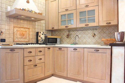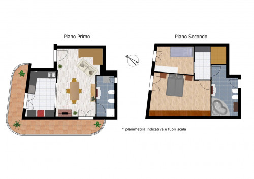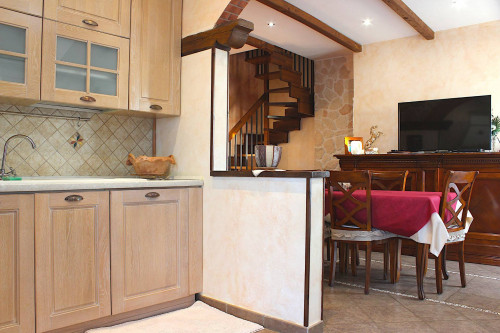 Entrando, al primo piano, si trova il soggiorno e il cucinotto: entrambi hanno un affaccio sul balcone che si sviluppa ad angolo intorno all'abitazione; allo stesso livello è presente un bagno con finestra, con doccia e spazio anche per la lavatrice.