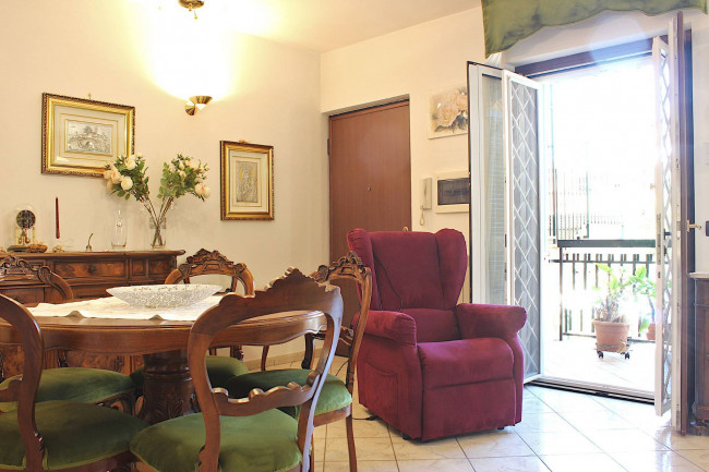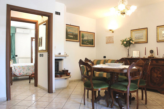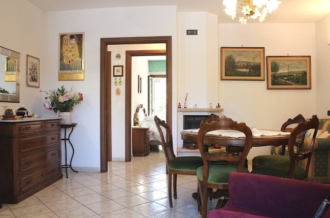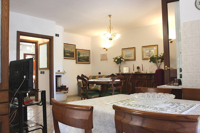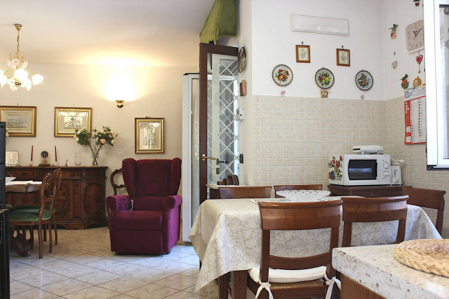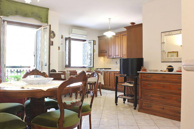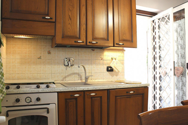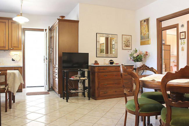 La zona giorno è comporta dal soggiorno con angolo cottura con affaccio sul balcone, corredato da tende da sole. Un termocamino offre un'alternativa di riscaldamento alla caldaia a metano con caloriferi in alluminio.