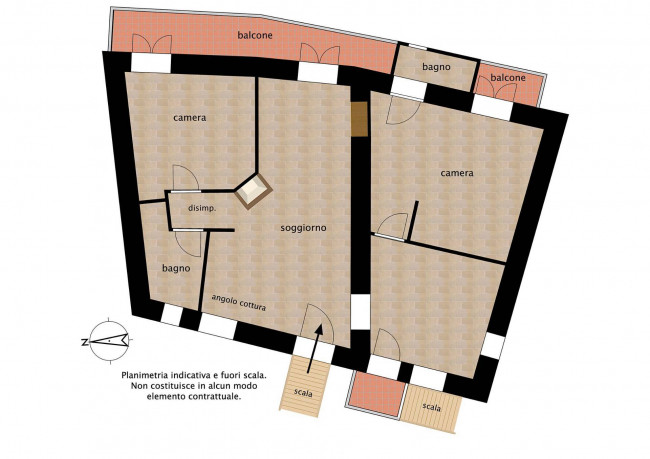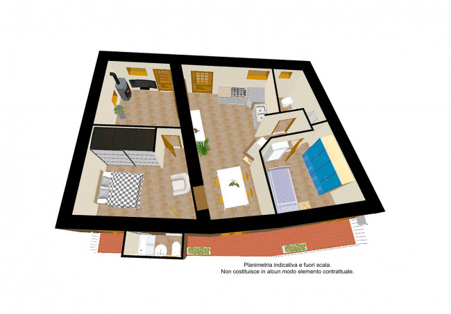 Entrando ci troviamo nel soggiorno con camino e angolo cottura in muratura. Da qui, un disimpegno conduce alla prima camera da letto e a un bagno. Sul lato opposto, si apre un secondo spazio giorno con stufa a legna con forno, da cui si accede alla seconda camera da letto con bagno privato.