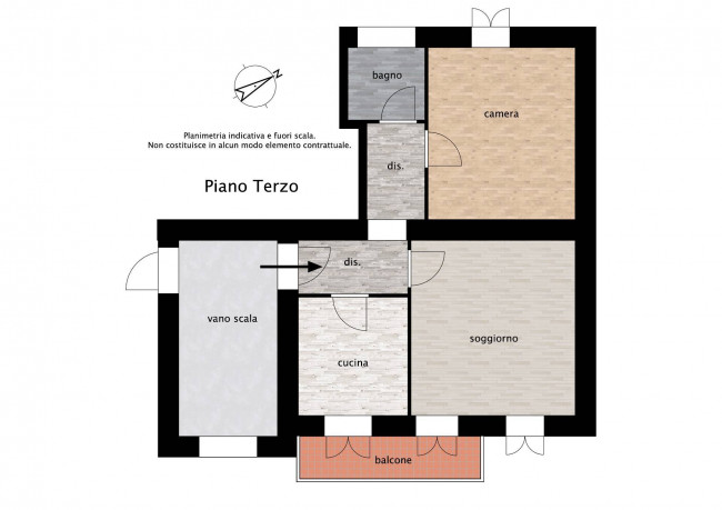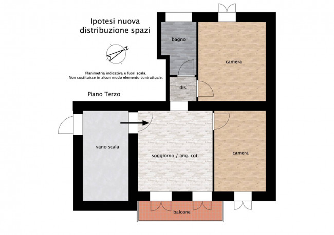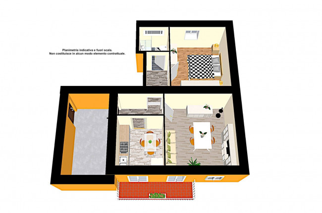 L'abitazione, di circa 65 mq, attualmente è composto da una cucina abitabile, una sala, un disimpegno, una camera e un bagno con doccia; la zona giorno affaccia sul balcone dove è presente la caldaia recentemente sostituita.