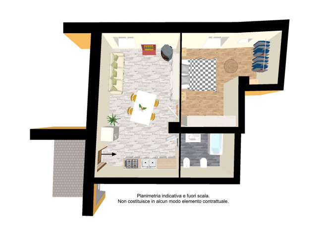 Superato il portoncino d'ingresso blindato e a vetri, si entra nel soggiorno con angolo cottura arredato ed equipaggiato, il camino sul lato opposto e una stufa a pellet che riscalda l'intera casa. La camera da letto ha uno spazio aggiuntivo interno che potrebbe diventare una cabina armadio oppure una zona studio, con la sua finestra.