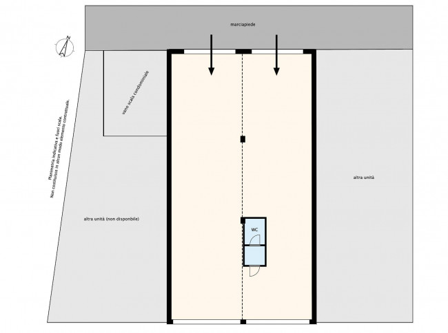 Le due entrate - con larghezza utile di circa 3 metri - affacciano sulla corte condominiale posta frontalmente alla via principale. Le finestre interne sono poste in alto, sui lati scoperti opposti all'entrata, così da consentire un'ottima illuminazione naturale, non pregiudicando l'uso delle pareti.