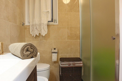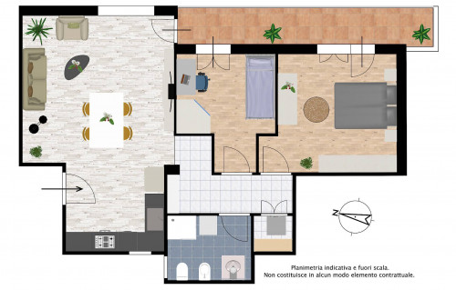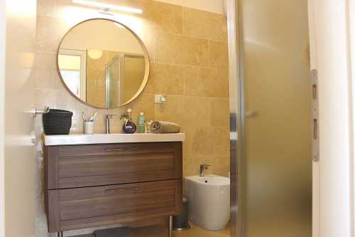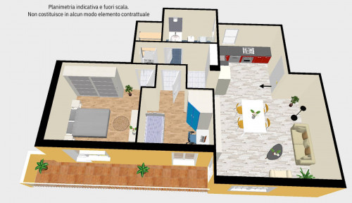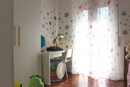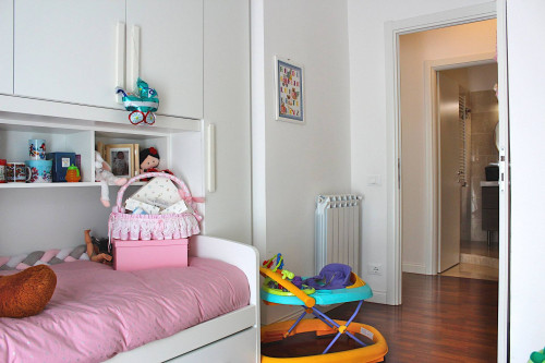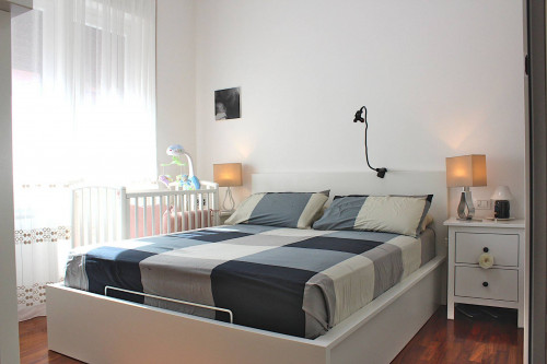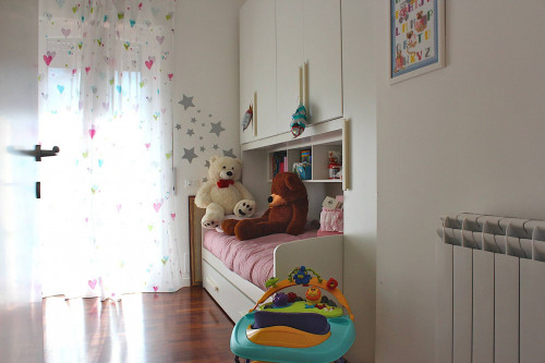 Tramite il disimpegno si entra nella zona notte, costituta dalla camera da letto e dalla cameretta, dal bagno con un ampio box doccia e da un comodo ripostiglio con spazio per la lavatrice.