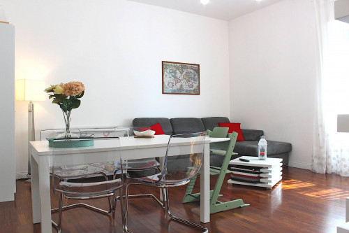 Il complesso condominiale è costituito da tre edifici in cortina, e sarà oggetto a breve di un intervento di rifacimento delle facciate: il cortile comune interno, curato ed elegante, permette di accedere ai diversi portoni e alla zona parcheggio, dove è disponibile l'uso di un posto auto.
